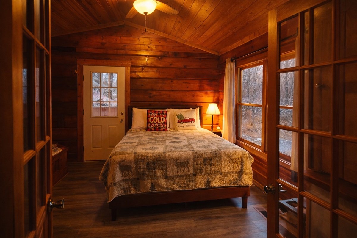 The bedroom features a King Sized Bed, a bathroom, and an exit leading to the enclosed deck where you can relax after a long day of adventures in the Smoky Mountains.